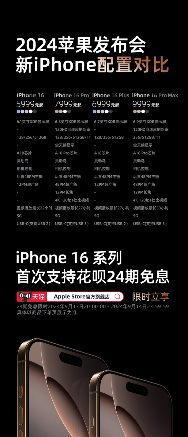 今日,苹果最新iPhone16系列发布。该系列四款机型将于9月13日20时起,在苹果天猫期舰店首发预售,预售前28小时,支持花呗24期分期免息购买。这是苹果首...