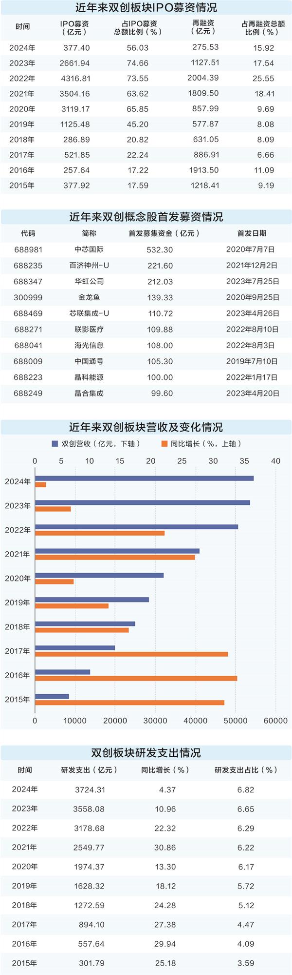 据证券时报·数据宝统计,以发行日期为基准,硬科技集中的“双创”板块(创业板、科创板)2021年至2024年间累计IPO募资额超过万亿元,再融资额超过5200亿元。从募资占比看,“硬科技”越来越受青睐,2021年至2023年IPO募资额连续3年占比超过60%,2023年占比更是超过74%,创出历史新高;2021年至2024年再融资额占比连续超过15%,2022年占比接近26%,创出新高。