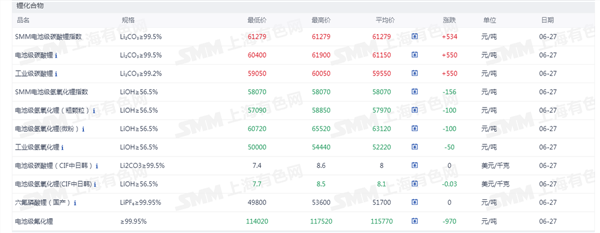 证券之星新能源车行业周报:据上海有色网,截止6月27日,电池级碳酸锂6.04-6.19万元/吨,均价6.115万元/吨,环比上一工作日上涨550元/吨;工业级碳酸锂5...