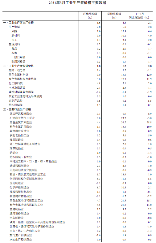 中国3月全国工业生产者出厂价格(PPI)同比上涨4.4%,涨幅为2018年7月来最大,超过预期的3.6%和前值1.7%;环比上涨1.6%。工业生产者购进价格同比上涨5.2%,环比上涨1.8%。1—3月平均,工业生产者出厂价格比去年同期上涨2.1%,工业生产者购进价格上涨2.8%。