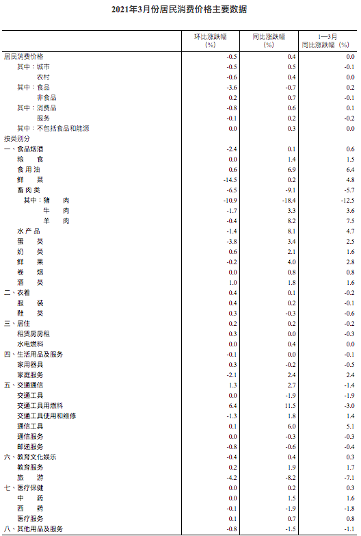 2021年3月份,全国居民消费价格同比上涨0.4%。其中,城市上涨0.5%,农村上涨0.4%;食品价格下降0.7%,非食品价格上涨0.7%;消费品价格上涨0.6%,服务价格上涨0.2%。一季度,全国居民消费价格与去年同期持平。