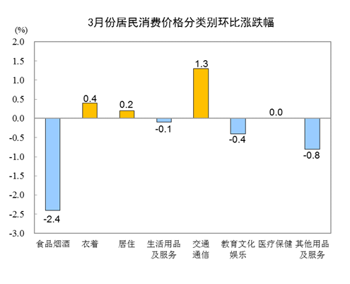 3月份,食品烟酒类价格环比下降2.4%,影响CPI下降约0.71个百分点。食品中,鲜菜价格下降14.5%,影响CPI下降约0.37个百分点;畜肉类价格下降6.5%,影响CPI下降约0.28个百分点,其中猪肉价格下降10.9%,影响CPI下降约0.24个百分点;蛋类价格下降3.8%,影响CPI下降约0.02个百分点;水产品价格下降1.4%,影响CPI下降约0.03个百分点。