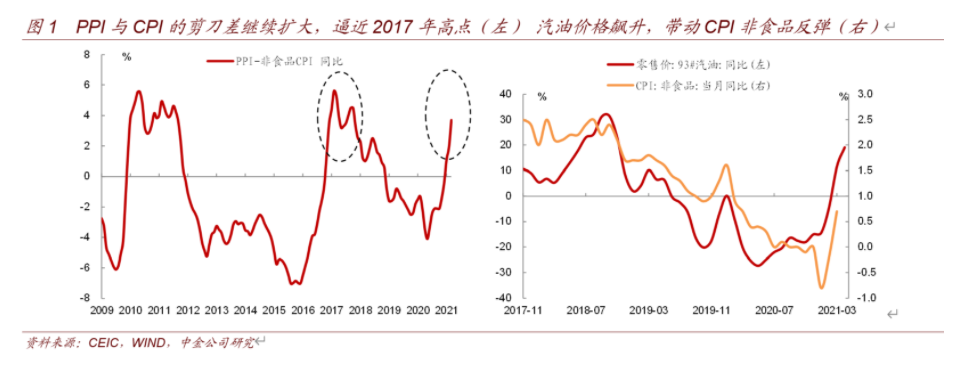 PPI与CPI的剪刀差继续扩大,下游企业利润或受挤压;随着国内消费继续恢复,CPI未来可能呈温和上行趋势;而在大宗商品价格推动下,未来PPI恐继续上行。...