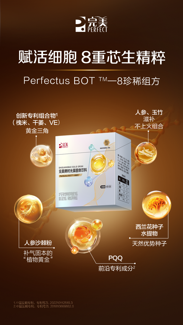 在核心配方研发上,完美时光葆专研Perfectus BOT™-8珍稀组方,精准复配PQQ(吡咯并喹啉醌二钠盐)、西兰花种子水提物、人参沙棘粉等8种核心原料,为消费者保持活力提供多方面守护。其中,PQQ作为前沿专利成分,具有赋活线粒体、促进细胞再生的功效;西兰花种子水提物富含萝卜硫素,能有效保护细胞免受损伤;人参沙棘粉则被誉为“植物黄金”,实现补气固本的天然滋养,8种原料协同作用,实现从根源上焕活细胞活力。